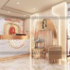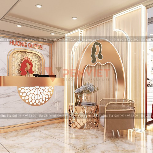Tiếp theo là khu vực lễ tân và tiếp đãi khách hàng. Tại đây, chúng tôi có bố trí một quầy lễ tân khá rộng và 1 bộ bàn ghế tiếp khách nhỏ vô cùng đáng yêu. Đằng sau có logo “ Huong Queen” và biểu tượng của cửa hàng.