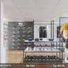 Sử dụng hệ thống kệ có kiểu dáng hiện đại, bắt mắt mang màu sơn xám ghi trung tính, KTS đã phối hợp được với màu sơn trắng của tường để tạo nên sự tương phản cho thiết kế cửa hàng. Nhờ vậy, không gian shop cân bằng được giữa nét trung tính và sự tinh tế. Ở giữa gian là một chiếc kệ 3 tầng giúp cho khách hàng có nhiều lựa chọn và thuận tiện để quan sát sản phẩm hơn.