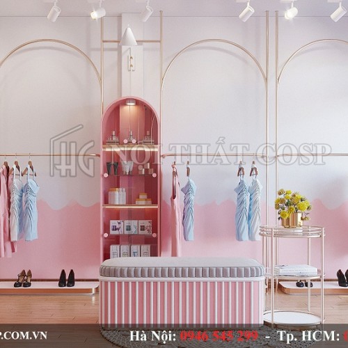 Hầu hết nội thất tại cửa hàng đều được thiết kế theo kiểu dáng hình vòm cổ điển, sang trọng. Điều này tạo sự đồng nhất xuyên suốt không gian giúp shop thời trang trở lên độc đáo, ấn tượng và chuyên nghiệp hơn trong mắt khách hàng. Kết hợp với hệ thống ánh sáng được thiết kế tinh tế khiến cho không gian cửa hàng trở nên lung linh, trang nhã hơn rất nhiều.