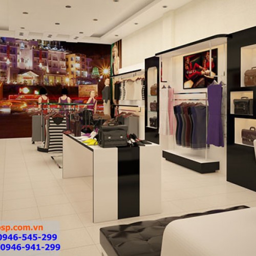 Ngoài những kệ thời trang, shop còn trang bị thêm bàn quầy thanh toán và backdrop in logo cửa hàng, tất cả đồ nội thất đều được thiết kế đồng bộ, và khéo léo đưa thương hiệu Logo của cửa hàng vào từng sản phẩm.