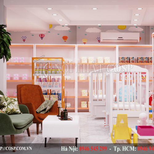 Đối với một thiết kế shop thời trang mẹ và bé, yếu tố chất liệu nội thất và màu sắc đóng một vai trò vô cùng quan trọng. Đến với công ty nội thất COSP, Công ty cổ phần dịch vụ Vietlife mong muốn có một không gian shop mẹ và bé ở Hà Nội có đầy đủ các yếu tố như chất liệu nội thất cao cấp, phù hợp và an toàn với không gian mua sắm của mẹ và bé.