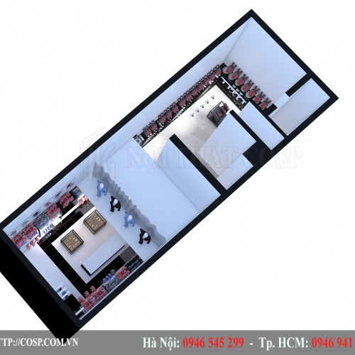Với góc chụp toàn cảnh từ trên này, bạn có thể đưa toàn bộ không gian shop thời trang nam Anh Kiên vào tầm mắt. Từ cách bố trí đến từng gam màu hay cả những chi tiết nhỏ dường như đang hòa làm một và tạo nên một không gian shop lịch lãm, cá tính và đầy nét sang trọng mà thân thiện với khách hàng.
