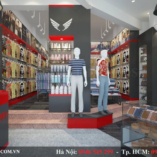 Phần nội thất cửa hàng thời trang nam đem lại sự khỏe khoắn nhờ màu sắc của đen xám kết hợp với màu đỏ tương phản. Kệ trưng bày quần áo đặt giữa nhà đảm bảo đủ không gian để trưng bày sản phẩm cho khách lựa chọn đồng thời đủ khả năng di chuyển mua bán thuận lợi trong shop. Sử dụng kệ sắt phun sơn tĩnh điện đảm bảo đủ độ chắc chắn cũng như tiết kiệm không gian sử dụng.