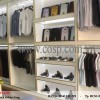 Hệ thống tủ trưng bày trong thiết kế shop thời trang nam sử dụng màu trắng trẻ trung và thanh lịch. Kết hợp với các đường viền tủ màu vàng kim loại để tạo điểm nhấn cũng như đem tới vẻ sang trọng và cao cấp cho không gian nội thất.