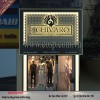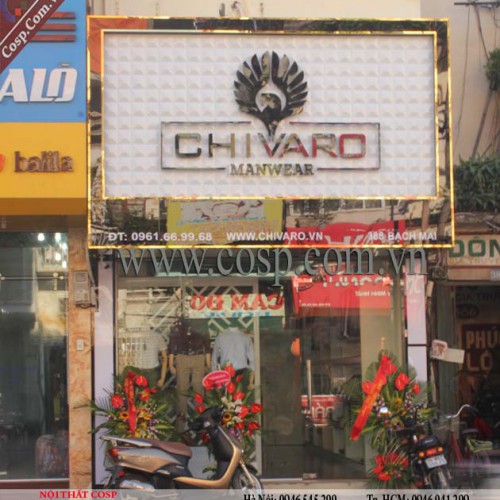 Thiết kế shop thời trang nam có mặt tiền rất nổi bật với tẩm biển hiệu cửa hàng mang logo của thương hiệu thời trang Chivaro. Màu sắc trên biển hiệu rất đơn giản với hai màu đen và trắng nhưng vẫn làm nổi bật lên vẻ sang trọng, thanh lịch bởi chất liệu alu gương bóng và viền màu vàng kim loại hết sức nổi bật. Màu đen là màu sắc tượng trưng cho sự sang trọng, thanh lịch, pha chút bí ẩn, là đại diện cho sự mạnh mẽ của nam giới đem lại sự cá tính cho bất cứ không gian nội thất shop thời trang nào.