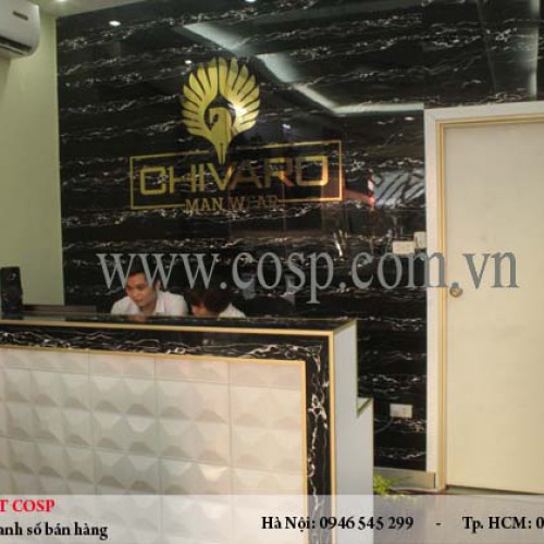 Màu sắc chủ đạo của thiết kế shop quần áo Chivaro này là màu trắng nhưng vách logo phía sau quầy thu ngân có màu đen để gợi nhớ tới sự cao cấp, sang trọng và thanh lịch của các sản phẩm thời trang nam mà Chivaro đem tới cho khách hàng. Logo của shop được làm bằng vật liệu màu vàng ánh kim rất sang trọng và nổi bật trên nền màu đen rất lịch lãm và nam tính.