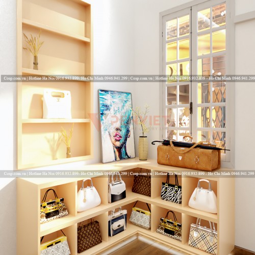 Phía tường bên phải là khu vực trưng bày túi xách cao cấp. Những chiếc túi xách này được đặt vào trong chiếc tủ đồ kê sát tường hình chữ L gỗ MDF cốt xanh chống ẩm. Phía trên là một hộc để đồ âm tường cũng bằng loại gỗ công nghiệp cao cấp này.