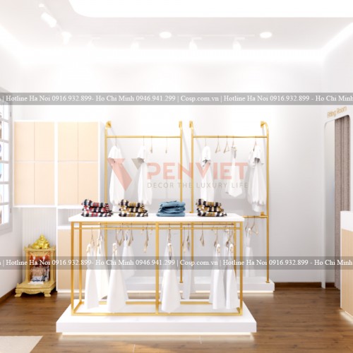 Nội thất trong shop thời trang bao gồm kệ treo ngang, hộc để tủ, gương treo tường và tủ đồ gấp. Những chiếc kệ treo thiết kế đơn gian bằng những thanh sắt sơn tĩnh điện nhũ vàng kết hợp với gỗ MDF cốt xanh chống ẩm phủ melamine. Nó vừa có tác dụng treo đồ vừa có thể để đồ ở tư thế gấp.