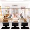 Bước vào cửa hàng các bạn thấy ngay quầy thu ngân khá rộng rãi cho 3 nhân viên sử dụng. Bàn quầy thu ngân bằng gỗ MDF cốt xanh chống ẩm phủ Melamine, trên bàn có lỗ đi dây máy tính, dưới có ngăn kéo có khóa tủ giảm chấn. Vách logo sau quầy nổi bật với bộ chữ Huyền Hyn mặt alu mạ vàng phát sáng chân.