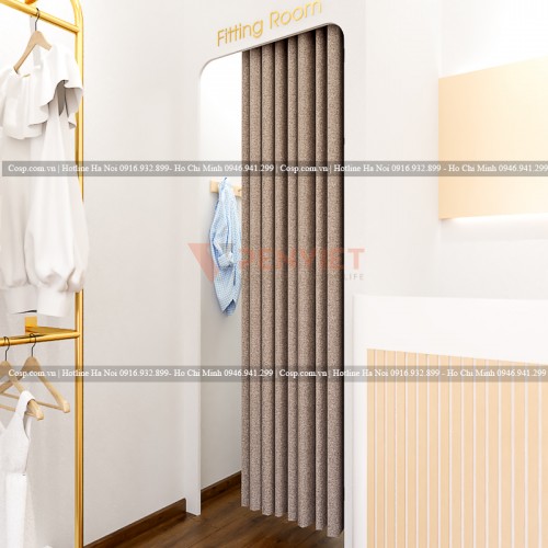 Phòng thay đồ ở trong góc có rèm vài che màu tối. Tuy chiếm một phần diện tích nhỏ nhưng lại rất cần thiết trong bất kỳ mẫu thiet ke shop thoi trang nào.