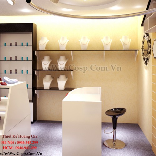 Chính vì các sản phẩm nữ trang có giá trị lớn hơn rất nhiều so với các mẫu quần áo nên Kiến trúc sư đã bố trí khu vực trưng bày nữ trang góc trong cùng cửa hàng, ngay bên cạnh quầy thanh toán. Mục đích của việc thiết kế shop như thế này là để thuận tiện hơn cho việc quản lý, tránh làm thất thoát các tài sản có giá trị.