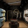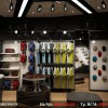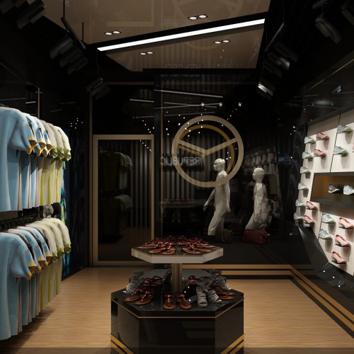 Cách sử dụng nội thất này góp phần tôn lên nét đẹp và giá trị sản phẩm hơn. Các kệ giá này được bố trí dọc hai bên tường để tối ưu diện tích cho không gian, mang đến một thiết kế shop thời trang nam rất khoa học. Ốc đảo nhỏ hình lục giác hai tầng được đặt ở chính giữa lối đi lại để trưng bày thêm các sản phẩm giày hay dép sandal.