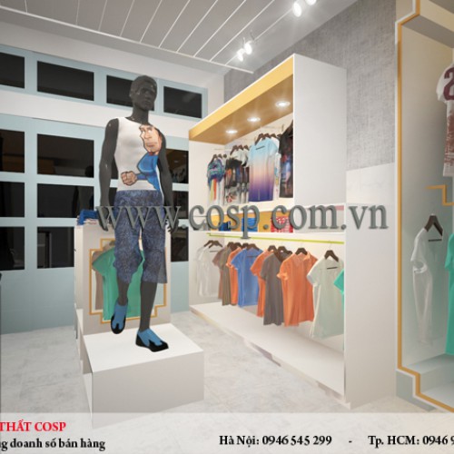 Thiết kế shop thời trang TP. HCM của chị Thoa mang phong cách trẻ trung và hiện đại với những sản phẩm thời trang thời trang nam. Vì đối tượng khách hàng mà shop hướng tới là các bạn nam khỏe khoắn, trẻ trung, năng động nên kiến trúc sư của Cosp cũng lựa chọn phong cách thiết kế toát lên được điều này.