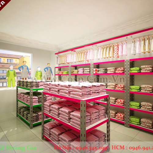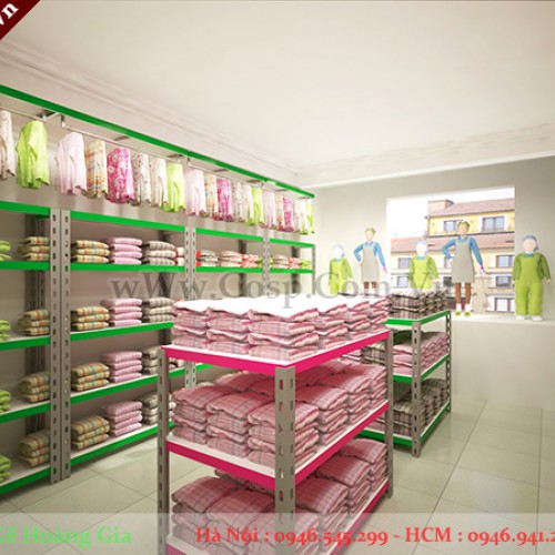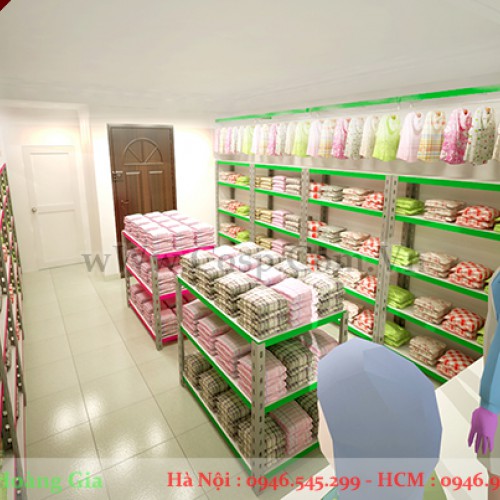 Ngoài khu vực trưng bày sản phẩm ở dưới tầng 1 thì Nội thất Cosp cũng nhận thiết kế thêm khu vực bày bán ở trên tầng 2 theo yêu cầu của anh Hải. Hơi khác với thiết kế shop quần áo dưới tầng 1, hệ thống kệ trưng bày tại tầng 2 được sử dụng hoàn toàn bằng chất liệu sắt sơn tĩnh điện chắc chắn. Các kệ này được chia làm các tầng khác nhau và trưng bày được rất nhiều các mẫu quần áo có thể gấp gọn được. Tận dụng khoảng không với trần nhà chính là hệ giá treo đơn giản để chủ shop treo các mẫu váy dễ thương cho các nàng công chúa nhỏ.