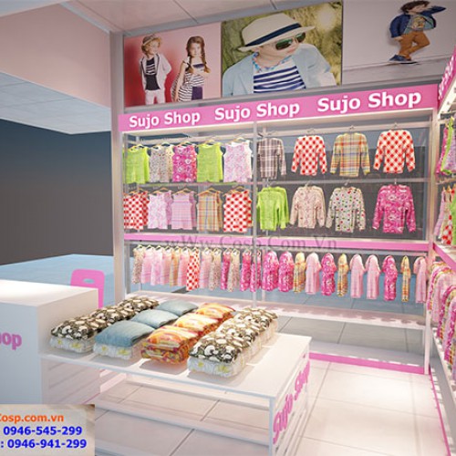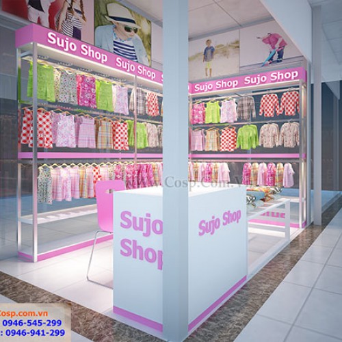 Hệ thống giá treo quần áo được làm bằng sắt sơn tĩnh điện với các tầng cao khác nhau giúp trưng bày được nhiều các mẫu quần áo nhất. Một chiếc bàn gỗ nhỏ được đặt ngay phía ngoài của cửa hàng nhằm phục vụ cho các hoạt động thanh toán được diễn ra thuận lợi. Bên cạnh là một chiếc kệ thấp để bày bán thêm các mẫu quần áo có thể gập được. Những bức tranh với hình mẫu nhí được treo sát trần làm thiết kế shop quần áo thêm nổi bật hơn rất nhiều.
