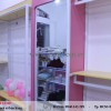 Hệ thống tủ trưng bày sản phẩm trong thiết kế shop thời trang dành cho mẹ và bé được bố trí sát tường giúp tiết kiệm diện tích. Thiết kế tủ đơn giản bố trí nhiều tầng và giá treo để trưng bày sản phẩm được nhiều hơn. Màu hồng và vàng tươi sáng còn có tác dụng mở rộng không gian khiến cửa hàng trở nên rộng rãi, thông thoáng hơn.