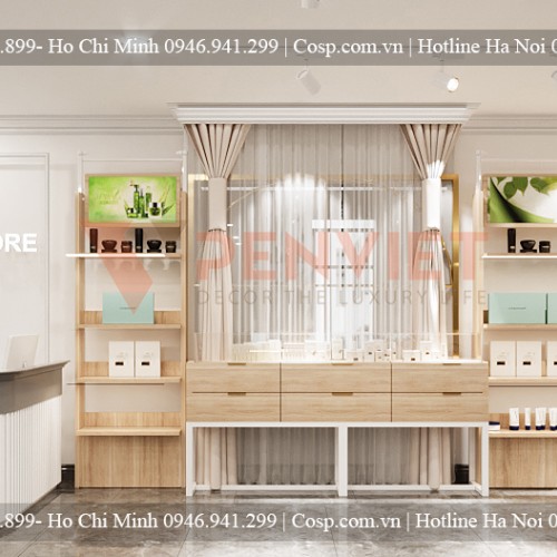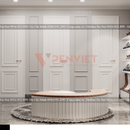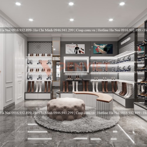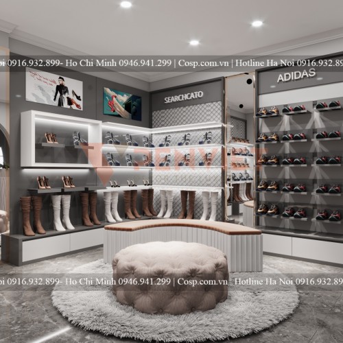Ngoài khu vực bày bán các sản phẩm quần áo, túi xách, KST của Nội thất Cosp còn thiết kế riêng một khu vực để trưng bày các sản phẩm giày dép cho chị em. Nội thất được sử dụng cho khu vực này là những chiếc kệ gỗ MDF cốt Thái Lan chống ẩm dày 17mm sát tường. Những chiếc kệ này được thiết kế với phần đợt trên sâu 300, hậu sơn trắng, khung inox 304 kích thước 25*25 cùng đèn led hộp mika lắp quanh tủ.
