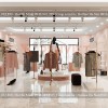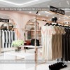 Với khu vực trưng bày các sản phẩm quần áo, chúng tôi sử dụng hai loại kệ trưng bày là kệ treo được gắn cố định vào tường và kệ đứng di rời được. Những chiếc kệ treo cố định được làm bằng inox 304 hộp 35*35mm màu vàng chống xước. Các đợt gỗ MDF cốt Thái Lan màu với kích thước 2800x500 mm được gắn vào kệ.