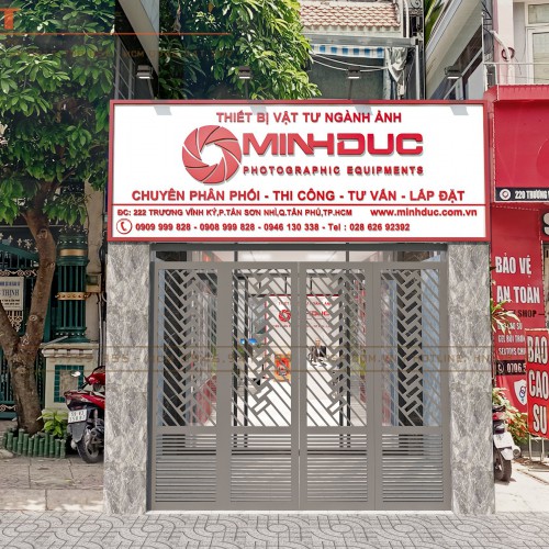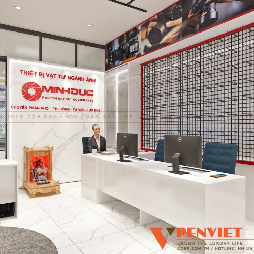 PenViet giúp chủ đầu tư tăng cường nhận diện thương hiệu trong mẫu thiết kế nội thất showroom máy ảnh Minh Đức bằng cách setup vách logo bằng nhựa PVC giả đá vân mây, hậu gỗ MDF kết hợp với đèn led dây hắt viền làm nổi bật tên cửa hàng bằng Mica dẹp cắt CNC. Giải pháp này mang tới sự hài lòng cho khách hàng.