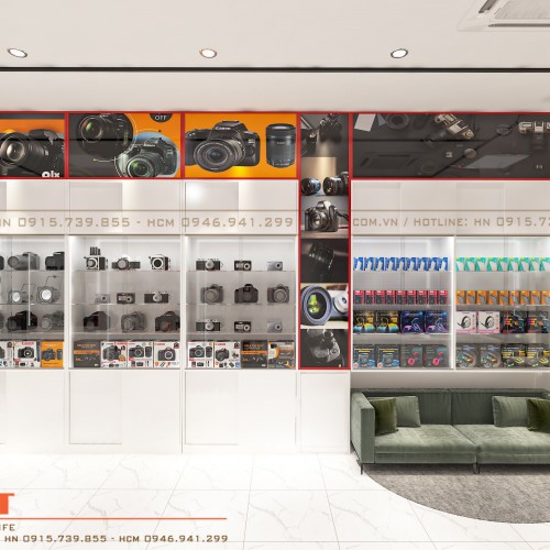 Việc setup mặt tiền đơn giản nhưng cũng không kém phần thu hút này còn tạo được sự nhất quán trong ý tưởng thiết kế showroom máy ảnh Minh Đức.