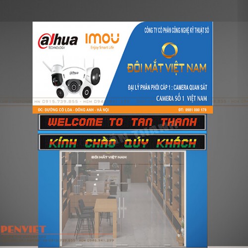 Penviet khéo léo lồng ghép nhận diện thương hiệu trong mẫu thiết kế showroom camera Đôi mắt Việt Nam với việc sử dụng vách logo Plawood và gỗ MDF chống ẩm làm nổi bật logo và bộ chữ tên doanh nghiệp bằng Mica và Mica phát sáng, giúp khách hàng có sự ghi nhớ về cửa hàng.
