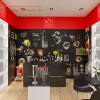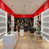 Sự kết hợp giữa cặp màu sắc tương phản trắng – đen kết hợp với điểm nhấn màu đỏ tạo nên hiệu ứng thị giác mạnh mẽ. Màu đen vừa tạo nên nét huyền bí, quyến rũ, lại vừa tạo nên chiều sâu cho không gian, giúp làm toát lên ý đồ của các kiến trúc sư khi setup cửa tiệm này.