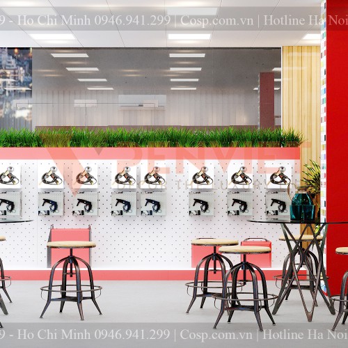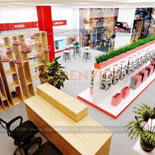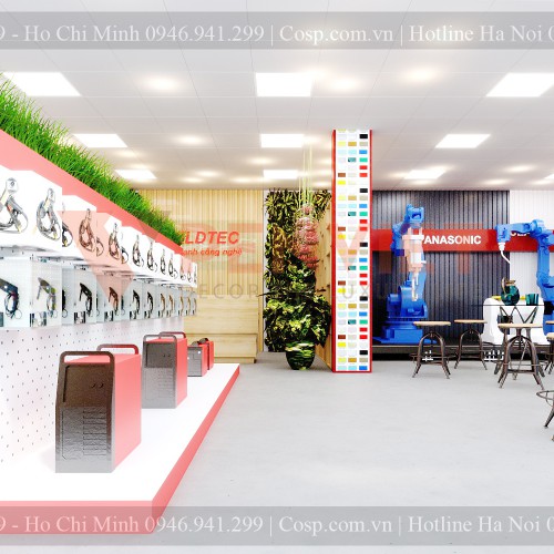 Để cân bằng lại màu sắc cho không gian showroom thiết bị hàn cắt Weldtec, chúng tôi sử dụng thực vật nhân tạo. Màu xanh tươi mới sẽ mang tới sự hài hòa hơn cho không gian toàn những màu nóng. Từ đó vừa tạo nên một thiết kế showroom thiết bị hàn cắt Weldtec đẹp, vừa đem đến sự thoải mái cho người nhìn.