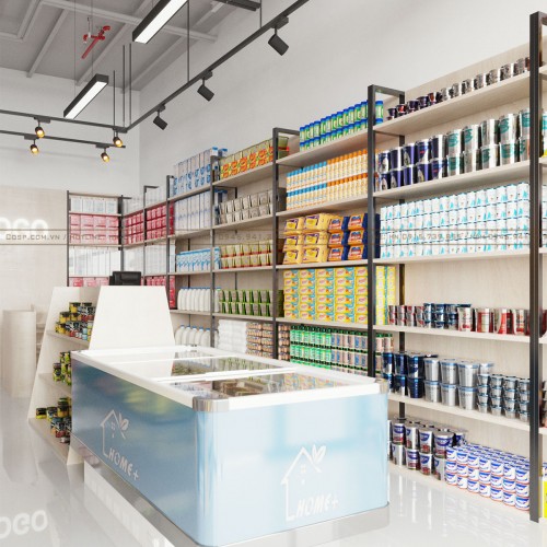 Bên cạnh đó, việc sử dụng những gam màu tươi sáng mang đến cảm giác rộng rãi, thông thoáng cho thiết kế siêu thị mini này. Đồng thời, điều này cũng giúp làm nổi bật các kệ hàng cũng như những chi tiết trang trí trong cửa hàng.