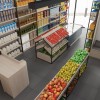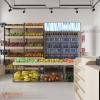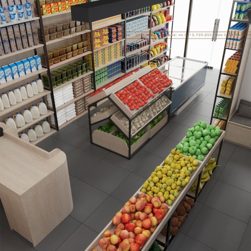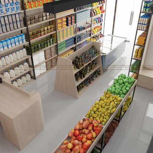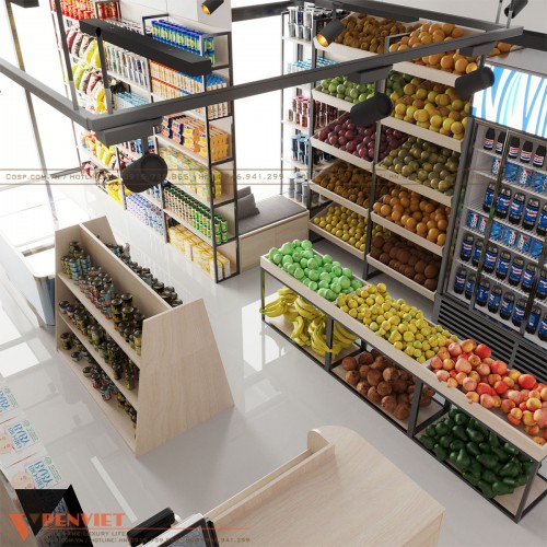 Bên cạnh đó, PenViet bố trí các kệ trưng bày bằng khung sắt hộp kết hợp gỗ MDF melamine chống ẩm cốt thái để bày bán mặt hàng hoa quả. Các kệ với kiểu dáng, vật liệu sử dụng đa dạng phù hợp với đặc trưng từng sản phẩm.