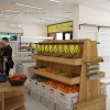 Được làm từ gỗ thông ghép thanh, khung sắt sơn tĩnh điện kết hợp với các móc treo trái cây, đây đều là những loại vật liệu có tính chống nước, phù hợp để làm các kệ trưng bày rau quả tươi. Ngoài ra, không chỉ có giá thành rẻ, mùi hương tự nhiên của gỗ thông ghép thanh cũng phù hợp để tạo nên tủ kệ bày bán nông sản trong các mẫu thiết kế siêu thị mini, do đó, nó thường được kiến trúc sư và chủ đầu tư ưa chuộng.