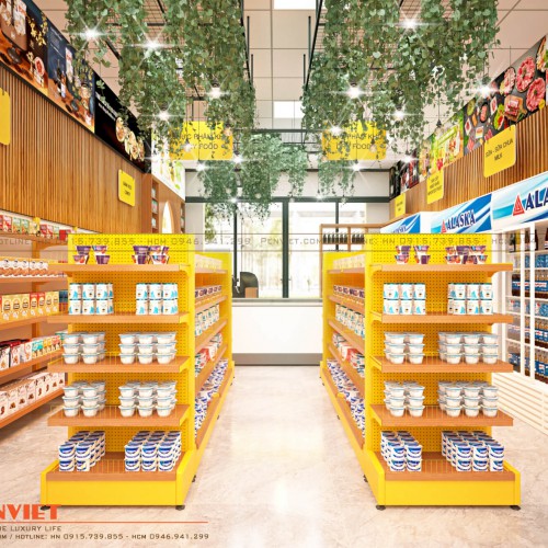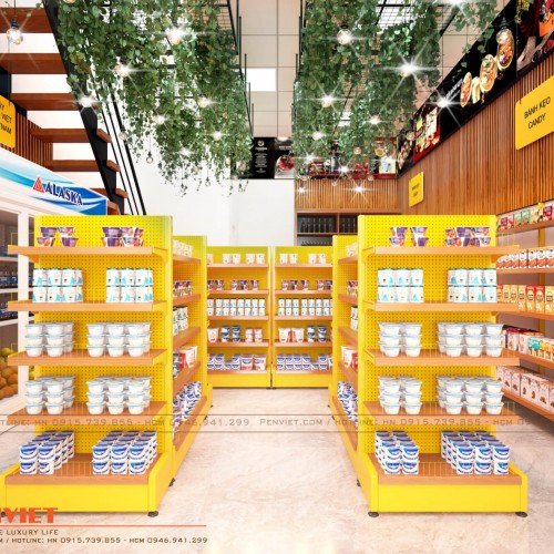 Các tủ trưng bày sản phẩm được bố trí khoa học, thể hiện ở việc phân chia rõ ràng khu vực bán đồ tươi và đồ khô. Để phù hợp với đặc trưng bày bán nhiều loại mặt hàng, mẫu thiết kế siêu thị mini này được Penviet sử dụng khung sắt sơn tĩnh điện có thể nâng hạ cho các kệ hàng sát tường, mang đến độ bền cho sản phẩm và sự thuận tiện cho người dùng.
