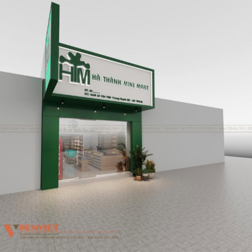 Thiết kế mặt tiền thu hút bởi sự phối hợp màu sắc hiện đại, tinh tế. Penviet sử dụng chất liệu Alu màu trắng kết hợp với khung sắt hộp mạ kẽm tạo độ bền và tính thẩm mỹ cho biển bảng. Màu sắc này cũng làm cho viền chỉ đập hộp tạo đèn led cùng bộ chữ Mica hộp “HM”, “HÀ THÀNH MINI MART” phát sáng và bộ chữ Mica dẹt thông tin liên hệ màu xanh lá cây càng trở nên nổi bật.
