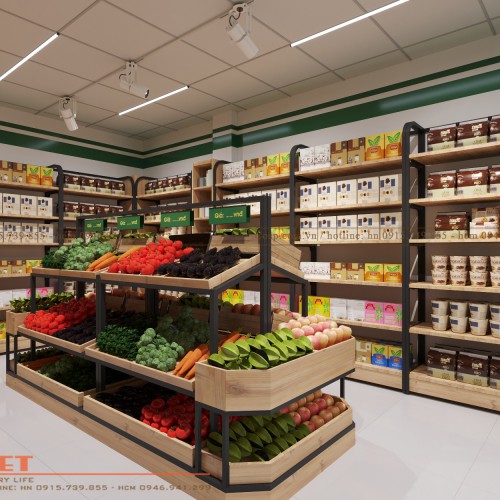 Bố trí mặt bằng khoa học với các kệ trung tâm bày bán sản phẩm rau quả chủ lực, được nhiều người lựa chọn cùng các tủ cao hai bên cũng cho thấy ý đồ của các kiến trúc sư khi tác động trực tiếp vào nhu cầu và hành vi tiêu dùng của khách hàng giúp tăng doanh số nhờ thiết kế siêu thị mini khôn ngoan, tinh tế.