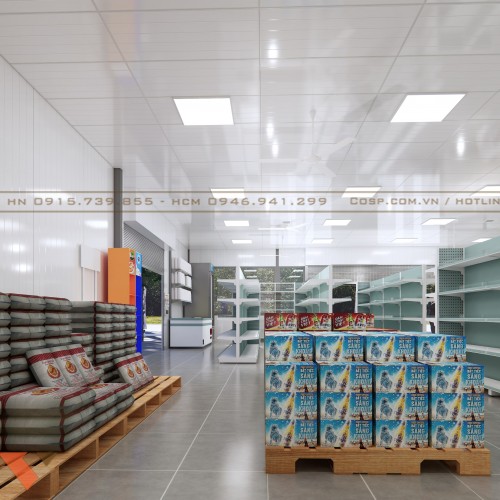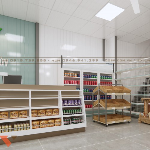 Phía sát các mảng tường là các dãy kệ đơn bày biện các sản phẩm tiêu dùng thiết yếu hoặc thực phẩm khô đóng gói. Việc tận dụng các khu vực sát tường giúp tối ưu không gian sử dụng, đồng thời đảm bảo góc nhìn trực diện khi khách bước vào.