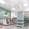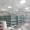 Toàn bộ trần siêu thị được lắp đặt đèn LED âm trần dạng ô vuông, tạo nguồn sáng đồng đều, dịu mắt và tiết kiệm điện. Ngoài ra, các quạt trần trắng cánh lớn được bố trí theo trục thẳng hàng giúp tăng cường đối lưu không khí.