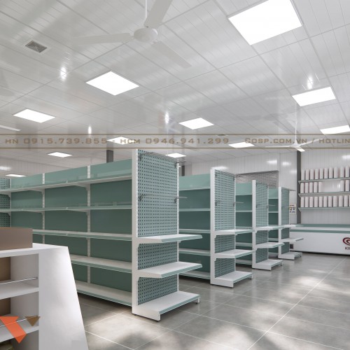Toàn bộ không gian bên trong được bố trí với hệ thống kệ đôi và kệ đơn lưng lưới dạng mô đun. Màu sắc chủ đạo của kệ là trắng phối xanh pastel đồng bộ với hệ màu tổng thể của siêu thị. Thiết kế dạng lưới phía sau không chỉ giúp thoáng khí mà còn tạo điểm neo móc cho các loại móc treo sản phẩm.