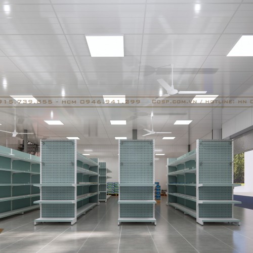 Kệ đôi được đặt ở trung tâm, chia lối đi rõ ràng và đều đặn, đảm bảo giao thông hai chiều mượt mà kể cả vào giờ cao điểm. Khoảng cách giữa các hàng kệ được tính toán kỹ lưỡng, đủ rộng để khách hàng di chuyển dễ dàng nhưng vẫn đảm bảo tận dụng tối đa diện tích trưng bày.