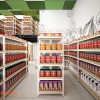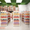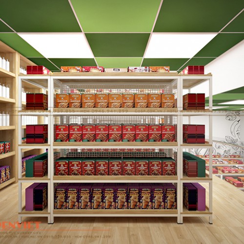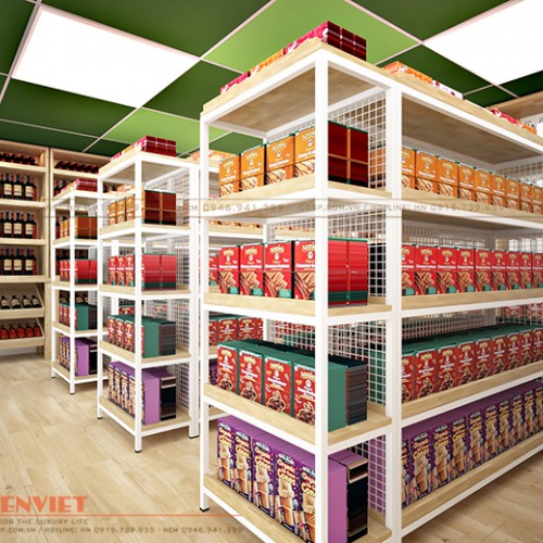 Sự kết hợp giữa gỗ thông ghép thanh với khung sắt sơn tĩnh điện và hậu lưới tạo nên sự vững trãi cho các kệ đồ khô sát tường và trung tâm cửa hàng.
