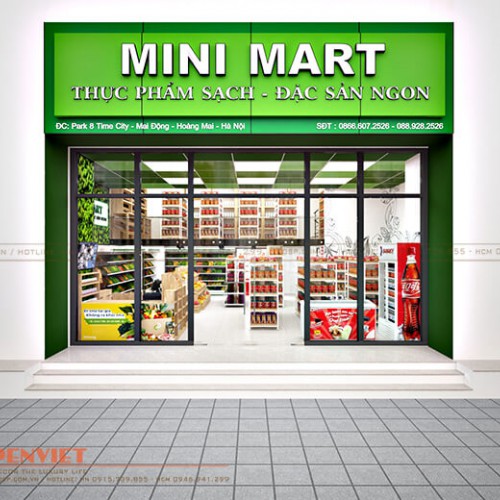 Vẻ nổi bật, thu hút của siêu thị được chúng tôi tạo nên nhờ việc sử dụng biển quảng cáo bằng Alu màu xanh lá cây ấn tượng giúp tôn lên bộ chữ tên siêu thị bằng Mica phát sáng mặt và các bộ chữ thông tin liên hệ làm từ Mica. Penviet lựa chọn khung xương sắt hộp, sắt V và hộp Alu để đảm bảo sự bền vững cũng như tính thẩm mỹ cho biển hiệu.