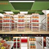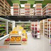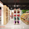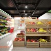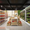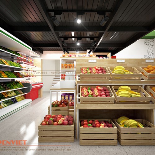 Khu vực bày bán trái cây trong thiết kế siêu thị mini AT Mart sử dụng kệ trưng bày bằng gỗ thông ghép thanh kết hợp với khung sắt sơn tĩnh điện và các giá gỗ giúp bày bán được nhiều loại sản phẩm cũng như hạn chế tính trạng sản phẩm bị rơi, dập.