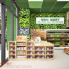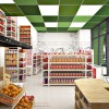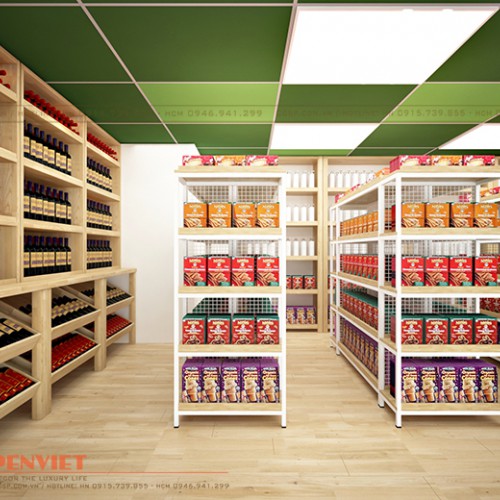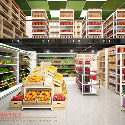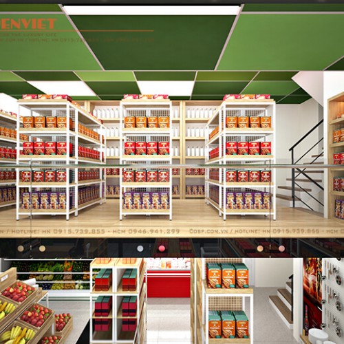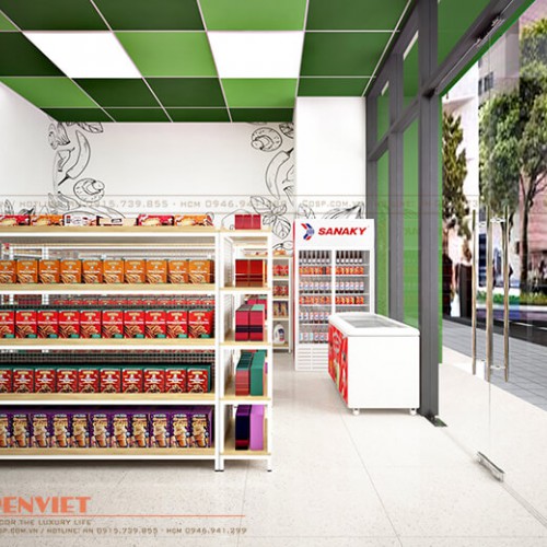 Thấu hiểu điều này, các kiến trúc sư Penviet tư vấn và định hướng thiết kế siêu thị mini này theo phong cách hiện đại, sử dụng màu xanh lá cây làm điểm nhấn cho không gian. Điều này không chỉ tạo nên hình ảnh cửa tiệm thân thiện, gần gũi với khách hàng mà nó còn thể hiện ý nghĩa về sự sinh sôi, phát triển, gần gũi với tự nhiên, xây dựng mối liên hệ với các sản phẩm sạch được bày bán tại đây.