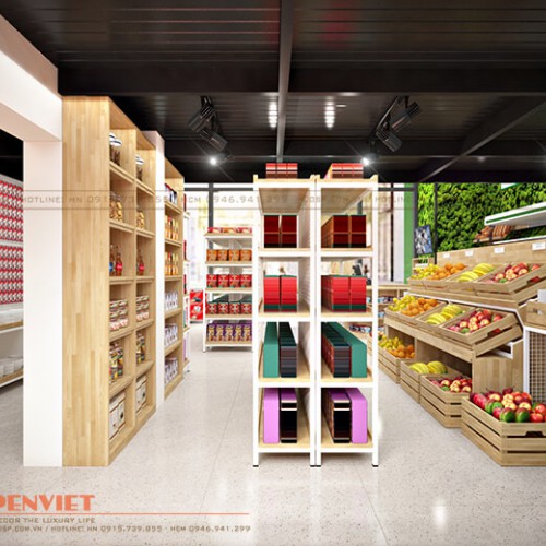 Với đặc trưng hàng hóa là các loại thực phẩm sạch, do đó, Penviet lựa chọn gỗ thông ghép thanh làm vật liệu chính cho thiết kế nội thất siêu thị mini này. Ngoài các đặc tính vốn có của gỗ tự nhiên như chống nước, chống ẩm thì gỗ thông qua xử lý còn mang những ưu điểm như chống cong vênh, mối mọt. Bên cạnh đó, mùi hương dễ chịu của loại vật liệu này cũng khiến chúng vô cùng thích hợp để tạo nên các kệ trưng bày, đặc biệt là kệ trưng bày nông sản, thực phẩm sạch.