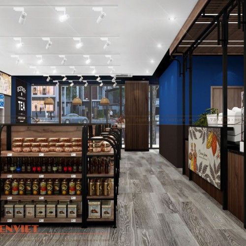 Ngoài ra, các kiến trúc sư của PenViet cũng tư vấn kỹ lưỡng cho khách hàng về việc lựa chọn kiểu dáng và hệ thống quầy kệ nội thất nhằm thể hiện sự nhất quán trong ý tưởng setup cũng như đảm bảo được công năng trong quá trình sử dụng và đặc trưng bày bán sản phẩm của siêu thị. Điều này khiến cho chủ đầu tư vô cùng hài lòng và càng thêm tin tưởng vào việc lựa chọn hợp tác thiết kế siêu thị mini kết hợp quán cafe cùng PenViet.