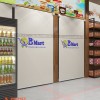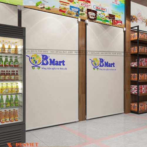 Trong dự án thiết kế siêu thị mini B’Mart, khu vực trưng bày hàng hóa này cũng gây ấn tượng với khách hàng nhờ được trang trí với các bức tranh quảng cáo trán trên phần quầy. Lối thiết kế này vừa mang đến sự sinh động cho không gian, vừa giúp cho việc vệ sinh trở nên dễ dàng hơn do hạn chế tình trạng bám bụi.