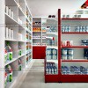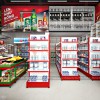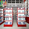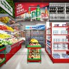 Tại vị trí trung tâm và bên phải của cửa hàng là các giá kệ trưng bày sản phẩm đóng gói với nhiều ngành sản phẩm khác nhau. Hệ thống kệ được sắp xếp với bố cục khoa học cùng kiểu dáng phù hợp với mặt hàng bày bán tạo không gian rộng thoáng và lối đi rộng rãi cho thiết kế cửa hàng tiện lợi.