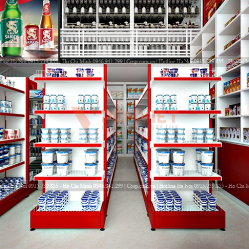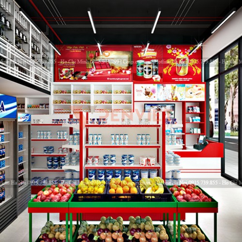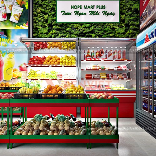 Các kệ đựng hoa quả, rau tươi được làm từ chất liệu sắt sơn tĩnh điện cùng gam màu phù hợp với tổng thể thiết kế cửa hàng tiện lợi. Chúng tôi lựa chọn loại vật liệu này bởi nó có giá cả phải chăng, độ bền cao và phù hợp với các siêu thị mini. Bên cạnh đó, vật liệu này cũng dễ dàng lau chùi và không thấm nước, vì vậy, cửa hàng lúc nào cũng sẽ sạch sẽ và tạo sự tin tưởng cho khách hàng.