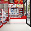 Chúng tôi sử dụng 2 gam màu chính cho toàn bộ cửa hàng là trắng và đỏ. Đây là những màu sắc có độ tương phản cao và nổi bật, giúp mang lại hiệu quả thu hút cho không gian cửa hàng. Đồ nội thất được thiết kế với kiểu dáng độc đáo, mang lại sự mới mẻ cho toàn bộ shop.