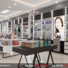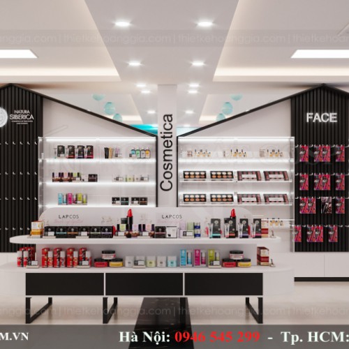 Các kệ bàn trưng bày mỹ phẩm và các vật dụng thiết yếu cho phụ nữ đều được sơn màu đen, xen vào chính giữa là một chiếc bàn mặt trắng với nửa phần dưới màu đen để tạo điểm nhấn.