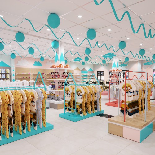 Toàn bộ trần nhà màu trắng đều được trang trí bóng bay màu xanh và dây lụa xanh đỏ. Những khung kệ liền tường được thiết kế như một hệ thống cánh cửa của một tòa lâu đài lớn, đặt bên trong là những khung trưng bày quần áo cho bé rất đa dạng.