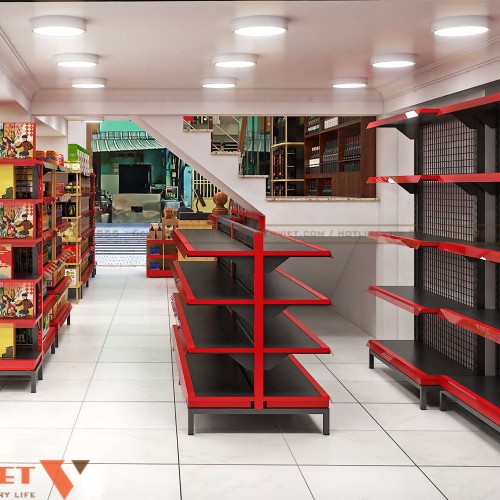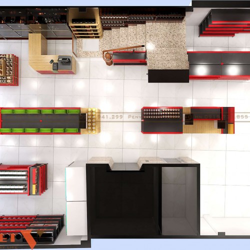 Chị Nguyệt, chủ đầu tư siêu thị mong muốn thiết kế cửa hàng theo phong cách hiện đại và nổi bật. Trước yêu cầu đó, PenViet đã đưa ra ý tưởng sử dụng gam màu vàng đỏ cùng cách bố trí nội thất khoa học, mang đến diện mạo thu hút và ấn tượng.